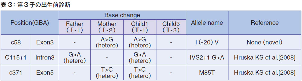その次に、第3子を妊娠されましたが、熊本大学にて出生前検査を受けていただきました。第3子には変異がなく、ゴーシェ病の発症はないであろうということで出産に至っています(表3)。その後、ゴーシェ病ではない第3子が生まれています。