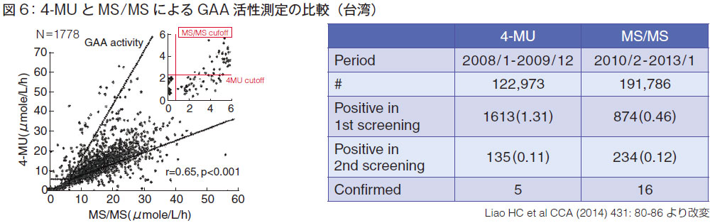 GAA活性をDBSを使ってMS/MSと4MUで測定比較しました(図6)。データは横軸はMS/MS、縦軸は4MUです。基本的に幾らかばらけるのですけれども、重要なのは、原点付近のところです。データにカットオフラインを入れてみました。すると、4MUのラインの右下あたりに点がたくさんあって、そこがフォールス・ポジティブになります。MS/MSでは、縦軸の0~1の付近には点がありますが、上の方の2~6の領域にはありません。